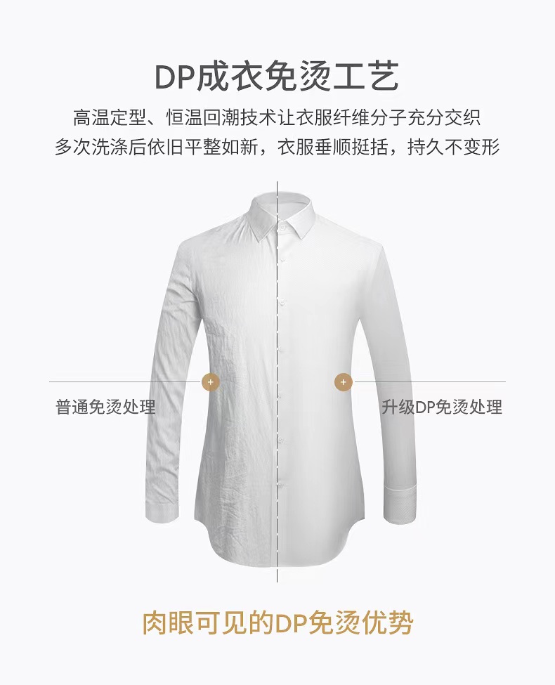 全棉成衣免烫,全身加衬抗皱,衬条工艺使整件衬衫及每一个接缝处更加平整,无拉扯感,穿起来更加笔挺有型。