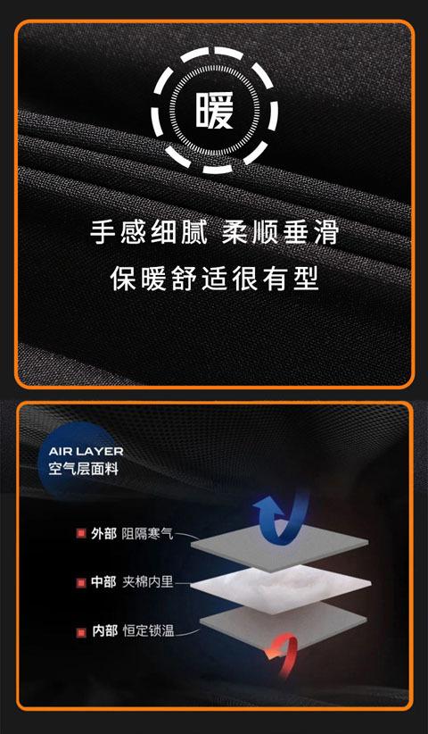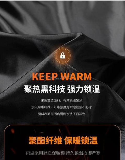 聚热黑科技,强力锁温。加入聚酯纤维,纤维强度好耐磨性强不起球,面料表面挺括爽滑耐水洗不易褪色。