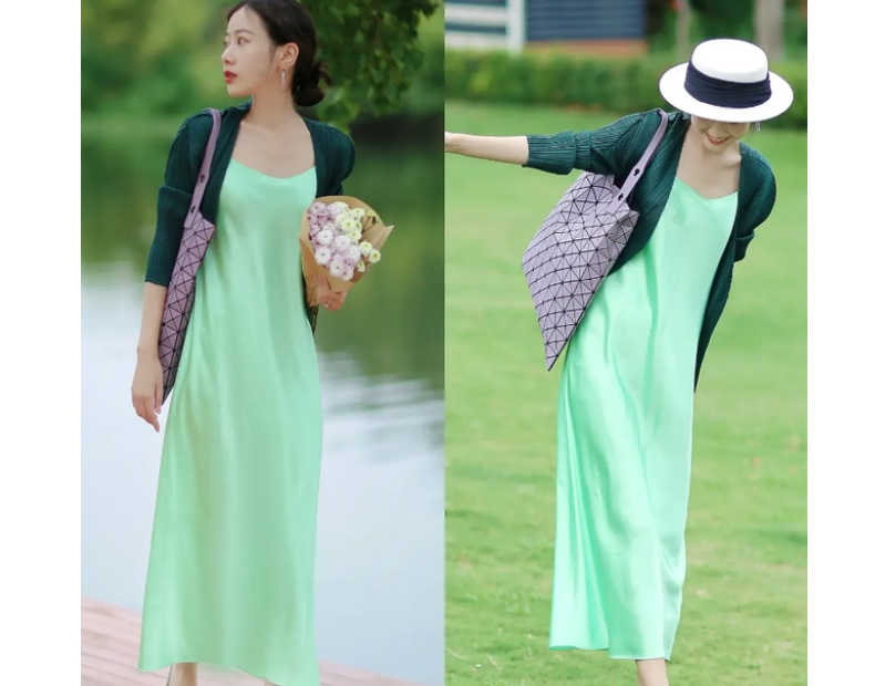 石家庄大衣定制认为浅绿色真丝吊带裙,很飘逸的质感,深V领的设计带着些小小的性感,女人味满满,外面套一件墨绿色的针织开衫,既有春天清新的气氛,又显得那样的温柔,真心好看。